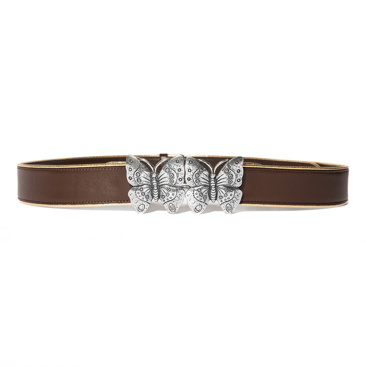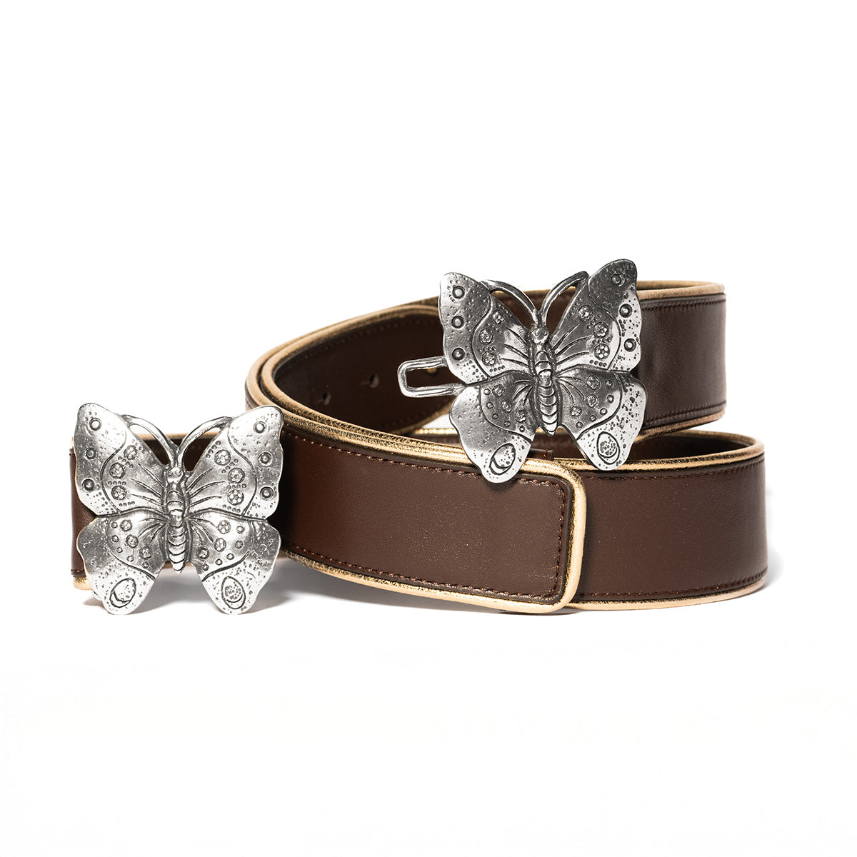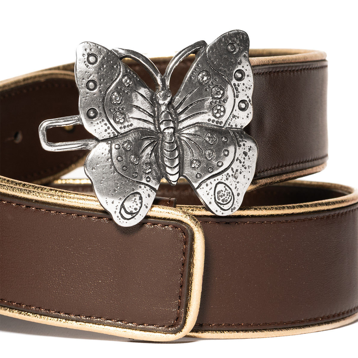 La vera protagonista è la nostra fibbia gioiello con farfalle affiancate. Un disegno esclusivo realizzato in metallo, con lavorazione a rilievo che richiama i dettagli preziosi della gioielleria antica.