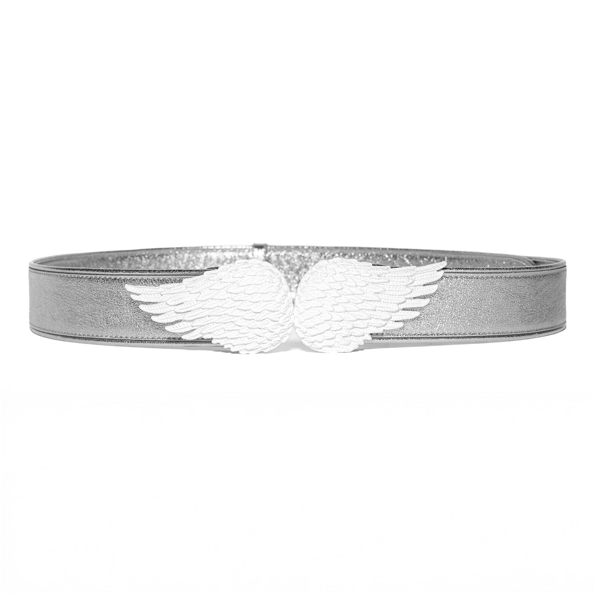 Il fusto in pelle liscia argentata, rifinito da un piping argentato, unisce eleganza e carattere. La fibbia gioiello disegnata in esclusiva raffigura ali in metallo inciso, dipinta di bianco ricche di dettagli che evocano leggerezza e forza.