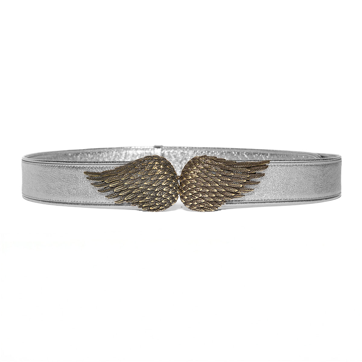 Il fusto in pelle liscia color argento, rifinito da un piping argentato, unisce eleganza e carattere. La fibbia gioiello disegnata in esclusiva raffigura ali dorate in metallo inciso, ricche di dettagli che evocano leggerezza e forza.