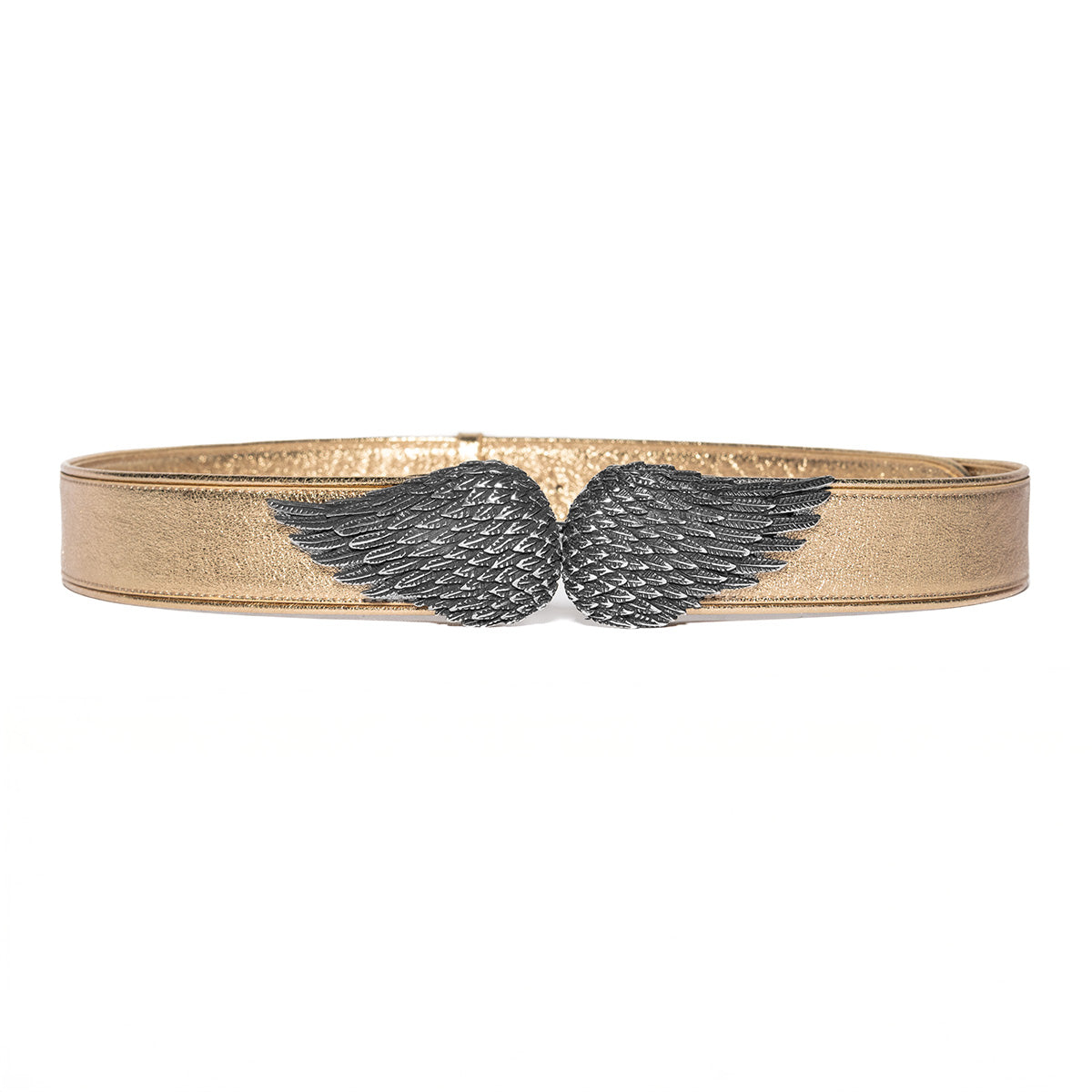 Il fusto in pelle liscia do, rifinito da un piping Dorato, unisce eleganza e carattere. La fibbia gioiello disegnata in esclusiva raffigura ali in metallo inciso, ricche di dettagli che evocano leggerezza e forza.