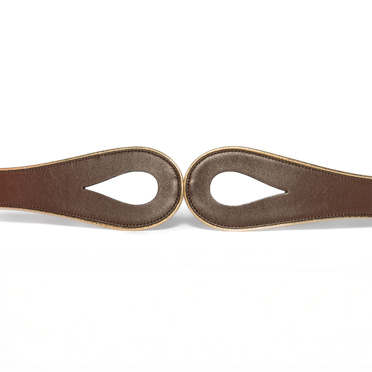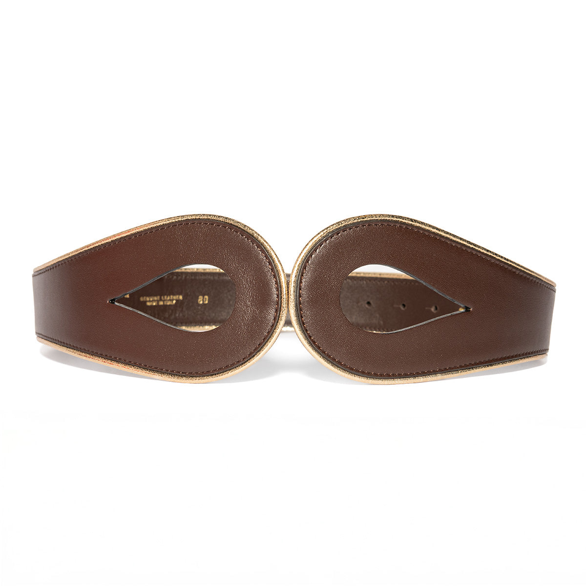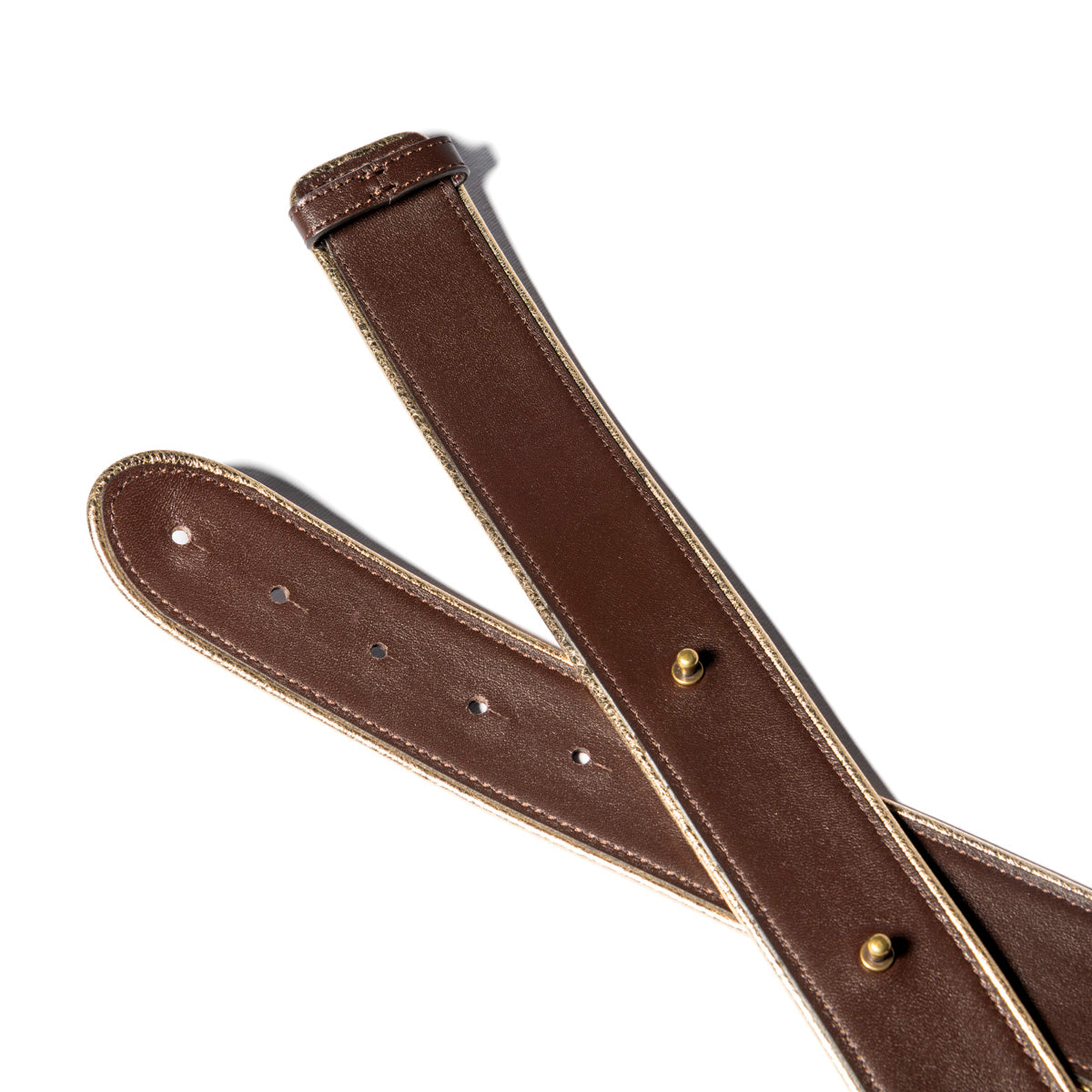 Pelle di vitello moro con profili rifiniti dal un sottile piping in pelle dorata.