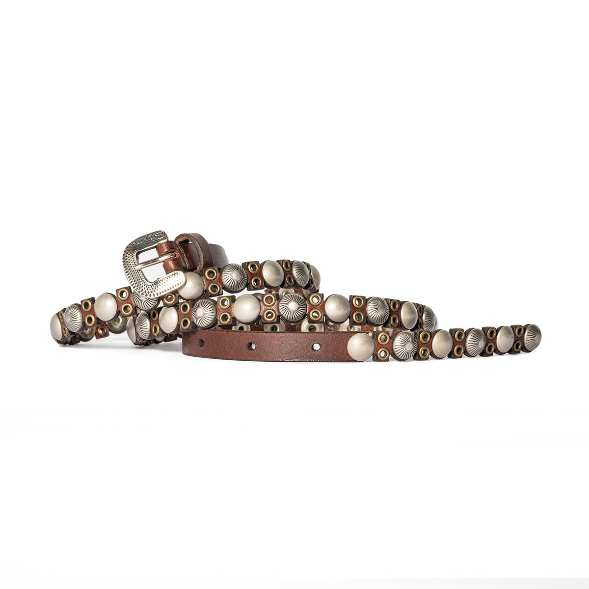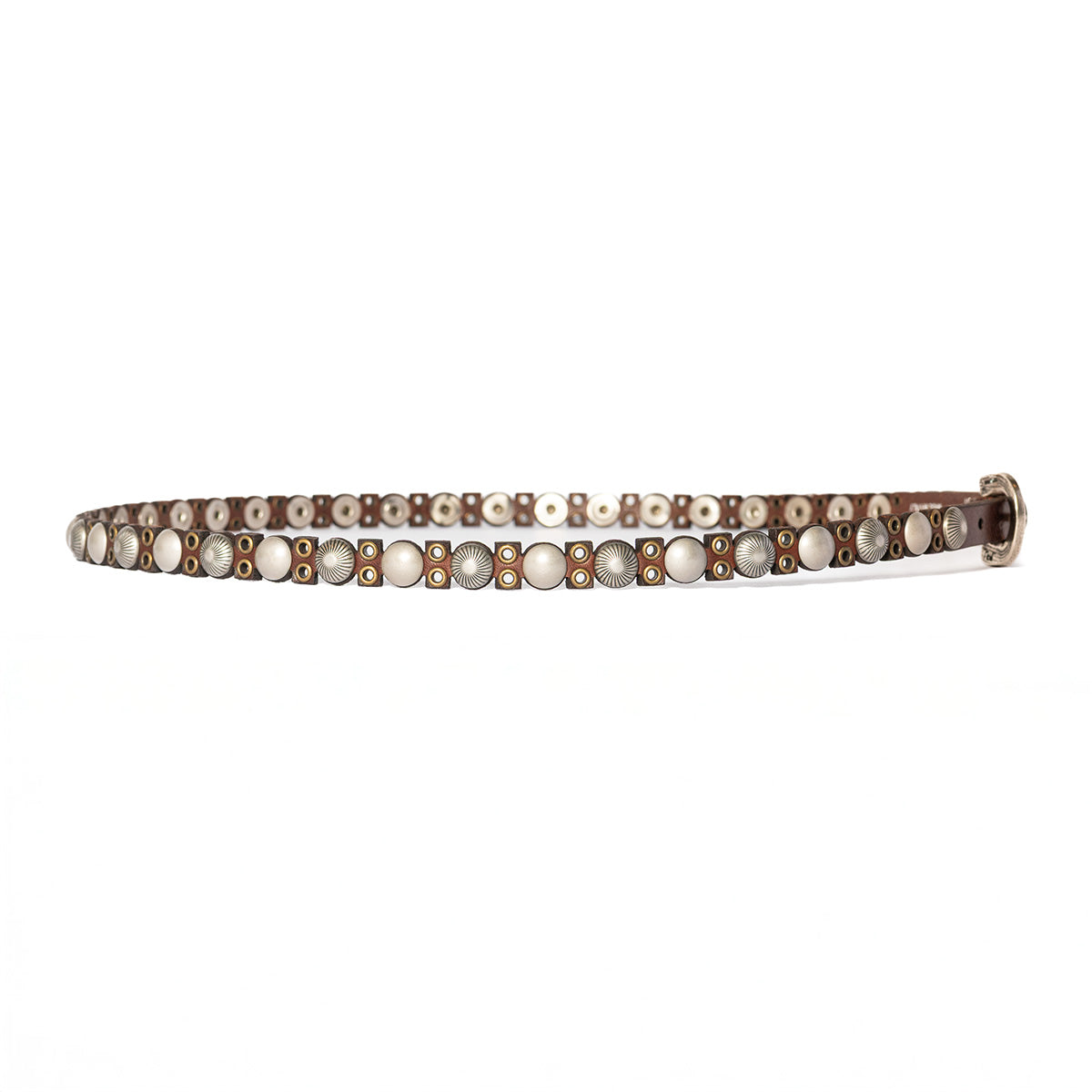Realizzata in cuoio toscano e sormontata da piccole pietre tonde e cabochon, che si alternano a piccole borchie argentate. Il suo spessore è inusuale, ma